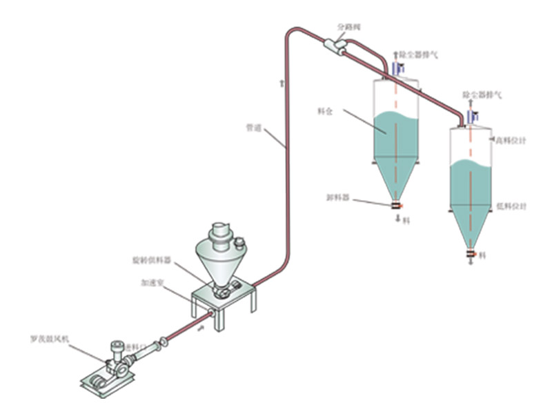 The pneumatic conveying system has low energy loss, long conveying distance, and high lifting height during the conveying process. When conveying materials such as powders and particles, it can reduce dust pollution, make the environment clean and tidy, and meet the national environmental protection standards. In this way, production efficiency is improved and pollution is reduced.